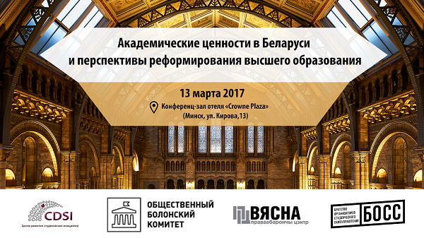 13 марта в конференц-зале отеля «Crowne Plaza» (Минск, ул. Кирова,13) состоится конференция «Академические ценности в Беларуси и перспективы реформирования высшего образования». Цель конференции: общественное обсуждение проблемных вопросов академических ценностей и формирование предложений по реформированию национальной системы высшего образования Республики Беларусь в соответствии с европейскими ценностями и стандартами.