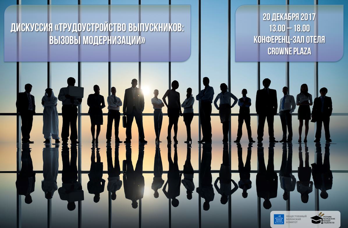 20 декабря Общественный болонский комитет и Программа «Распределение молодых специалистов» приглашает на дискуссию «Трудоустройство выпускников: вызовы модернизации». Дискуссия организуется с целью подготовки и поддержки изменений в Кодекс об образовании и смежное законодательство по вопросам трудоустройства выпускников.